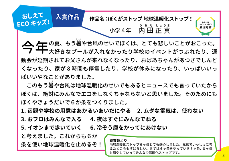 「おしえて ECO(エコ)キッズ!COOL CHOICEアイデアコンテスト」ご応募ありがとうございました!応募してもらった148作品の中から、エコアイデア・エコ発明部門、おもしろエピソート部門の合計14作品が入賞作品、33作品が入選作品として選ばれました。ぜひご覧ください!
