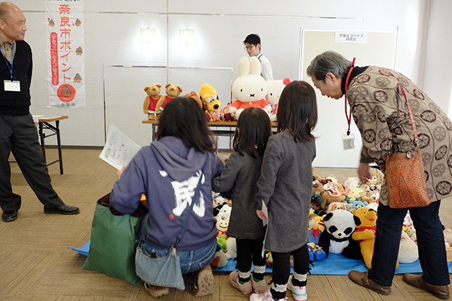 ホール前のロビーでは、エコに関する展示や、取り組み紹介、エコクイズや紙芝居のほか、ぬいぐるみの交換市なども行いました。