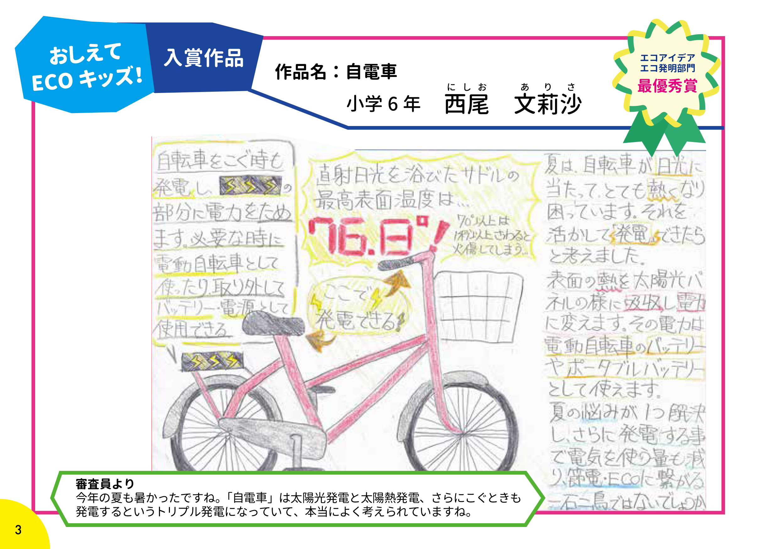 応募してもらった203作品の中から、エコアイデア・エコ発明部門、おもしろエピソート部門の合計11作品が入賞作品、14作品が入選作品として選ばれました。