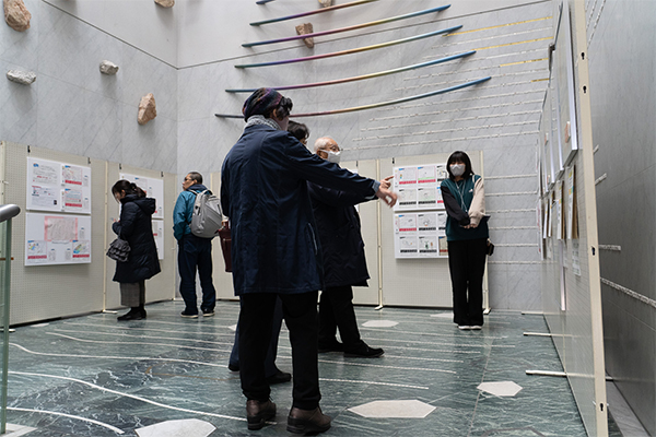 ならまちセンターの階段踊り場にて、作品の展示を行いました。子どもたちのユニークな作品を興味深く見つめる方々が印象的でした。