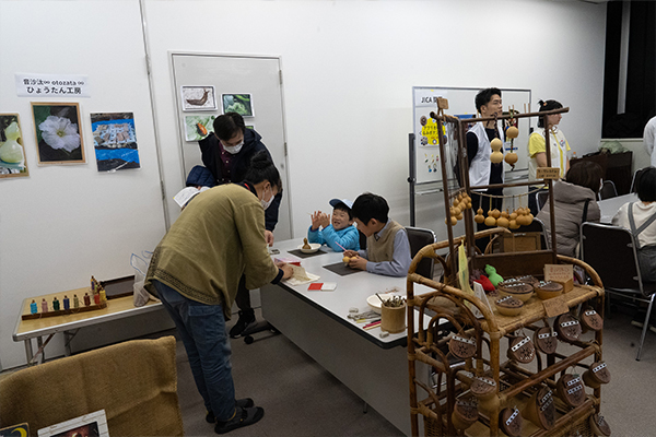 3階の会議室はクラフトを中心としたプログラムです。自家製ひょうたんを使ったマラカスやランプを作る体験、何度も使えるミツロウラップづくり、端材でつくるミサンガづくり、タネを使ったブローチづくり、葉っぱを使ったオーナメントづくり、アフリカの布を使ったくるみボタンづくりなど、それぞれエコな視点に基づいた体験です。ただ、作る体験というだけでなく、その素材と関連する自然や環境課題に対する意識啓発、国際理解の視点などバリエーションのある体験の提供となりました。